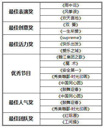 为表彰各公司在文艺汇演中的精彩表现和辛苦付出,周云、高艳分别为网络票选评出的最佳人气奖及最佳表演奖、最佳创意奖、最佳团队奖、最佳活力奖、优秀节目奖等团队颁奖。