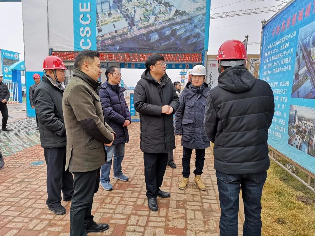 赵金城一行深入标准厂房、会展交易中心、公共研发中心及公共服务中心等工地进行实地察看。金开集团下属金力公司副总经理程智珩详细介绍了中医药科创城发展由来、功能定位、发展布局、发展目标并简要推介了中医药科创城内已入驻企业和即将入驻企业的基本情况和产品展示。