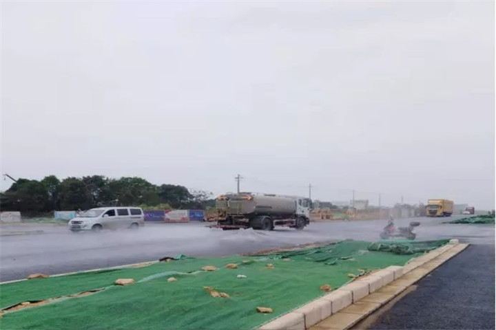 2、英雄大道全线裸土覆盖,洒水车洒水降尘,确保工地无扬尘;
