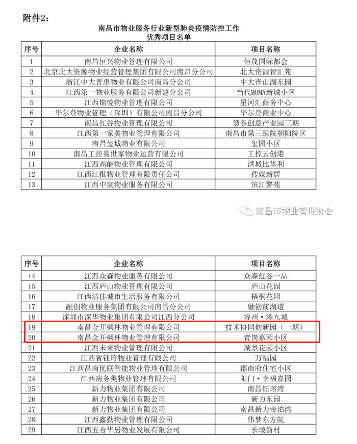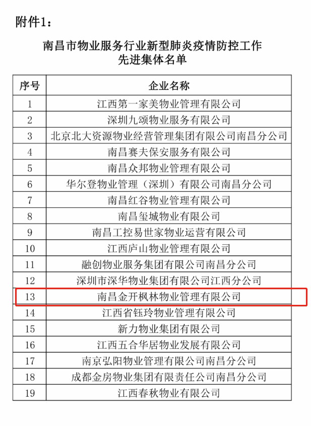 2022年6月22日,南昌市物业管理协会发布了《关于通报表彰南昌市物业服务行业新型肺炎疫情防控工作先进的通知》,其中,南昌金开枫林物业管理有限公司荣获了南昌市物业服务行业新型肺炎疫情防控工作先进集体,公司管辖的技术协同创新园(一期)和青岚嘉园小区荣获了市物业服务行业新型肺炎疫情防控工作优秀项目!